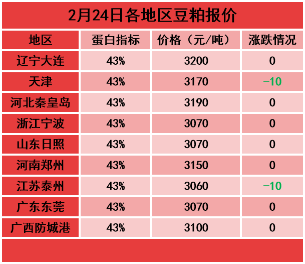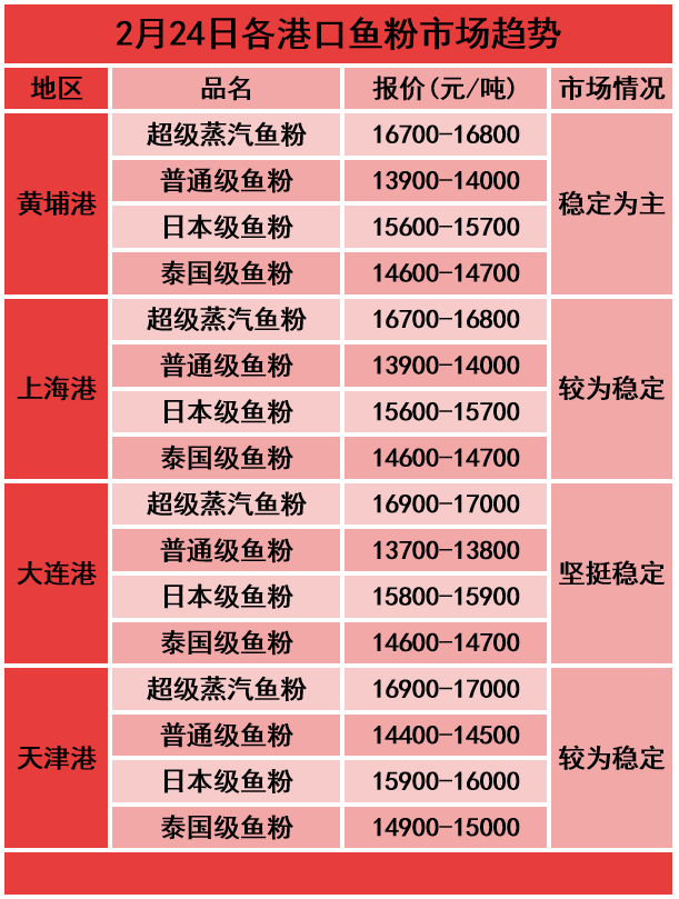 2月24日饲料原料行情:鱼粉价格稳定为主,豆粕价格上涨受限