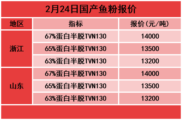 浙江地区,67%蛋白国产鱼粉参考报价在14000元/吨,65%蛋白国产鱼粉参考报价在13500元/吨,63%蛋白国产鱼粉参考报价在13200元/吨。