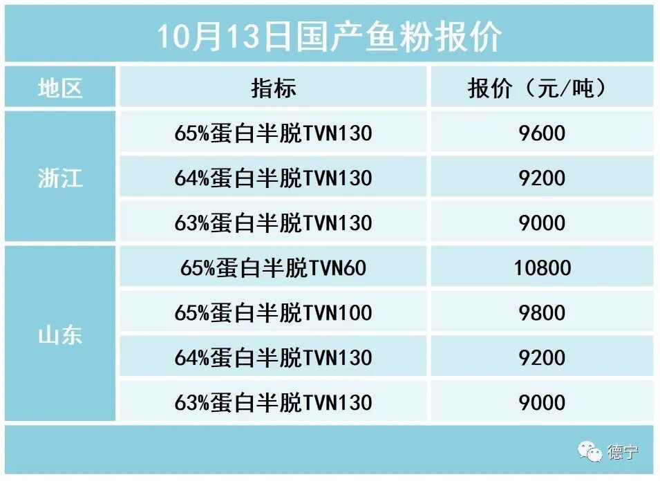 浙江地区,65/130半脱脂国产鱼粉参考报价在9600元/吨左右,64/130半脱脂国产鱼粉参考报价在9200元/吨左右,63/130半脱脂国产鱼粉参考报价在9000元/吨左右。