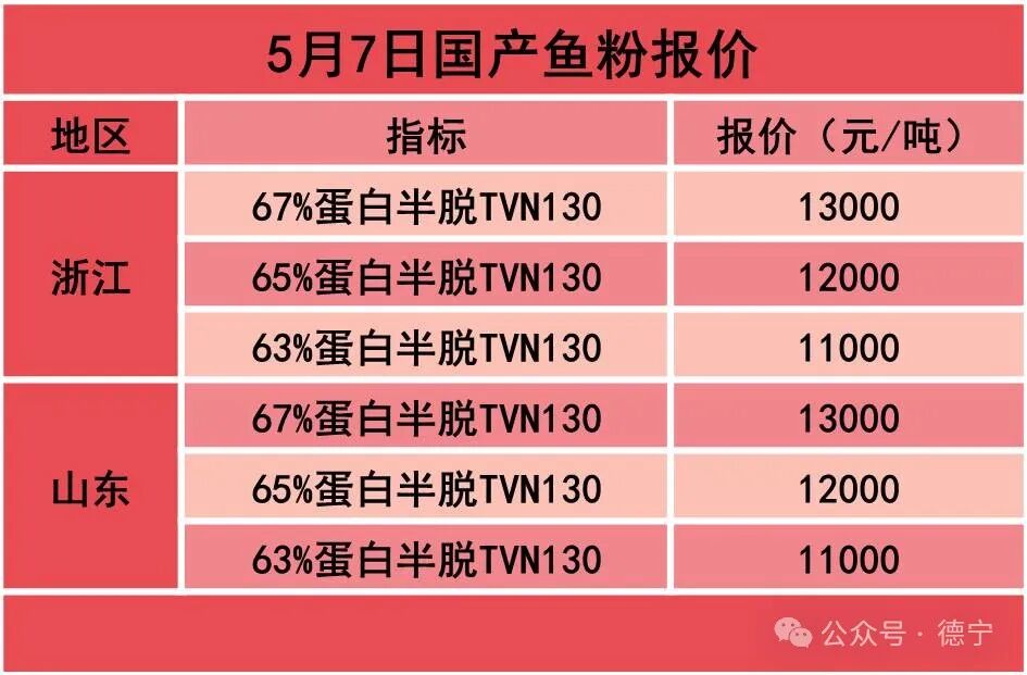 浙江地区,67/130半脱脂国产鱼粉参考报价在13500元/吨左右,65/130半脱脂国产鱼粉参考报价在12500元/吨左右,63/130半脱脂国产鱼粉参考报价在117000元/吨。