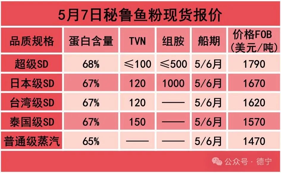 根据秘鲁生产部RMN°000118-2024-PRODUCE号公告,秘鲁2024年A季中北部鳀鱼捕捞配额247.5万吨,自当地时间4月16日零时起正式展开,2024年4月16日-5月17日秘鲁中北部捕鱼量为1587083吨,剩余配额数量为887917吨,完成配额比例为64.12%。