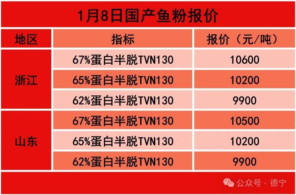 山东地区,67%蛋白TVN130半脱脂鱼粉参考报价10500元/吨左右,65%蛋白TVN130半脱脂鱼粉参考报价10200元/吨左右,62%蛋白TVN130半脱脂鱼粉参考报价9900元/吨。