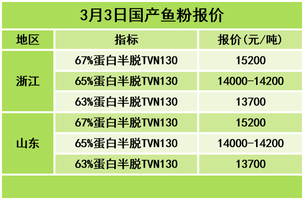 山东地区,67%蛋白TVN130国产鱼粉参考报价15200元/吨,65%蛋白TVN130国产鱼粉参考报价14000-14200元/吨,63%蛋白TVN130国产鱼粉参考报价13700元/吨。