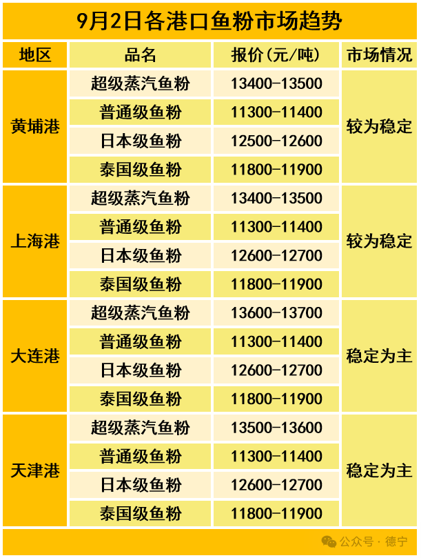 9月2日饲料原料行情:鱼粉价格稳定为主,豆粕库存继续增加