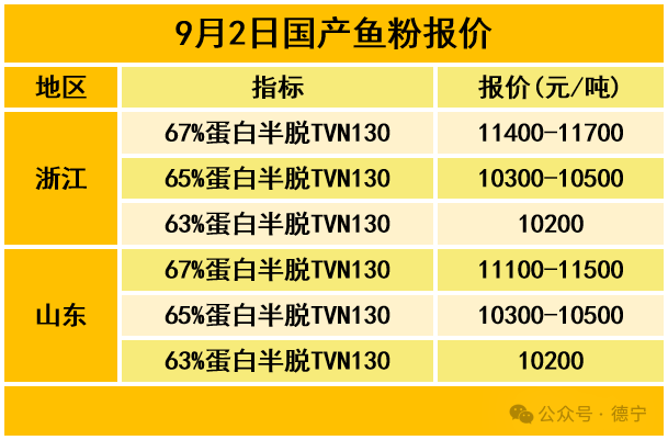 山东地区,67%蛋白TVN130国产鱼粉参考报价11100-11500元/吨,65%蛋白TVN130国产鱼粉参考报价10300-10500 元/吨,63%蛋白TVN130国产鱼粉参考报价10200元/吨。
