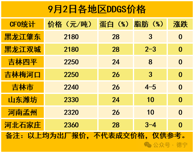 今日,DDGS价格弱稳。近期市场购销氛围一般,饲企采购积极性欠佳,原粮玉米价格有所下调,酒精企业生产利润有所改善,但酒精价格有所下跌,企业挺价心态升温,或支撑短期DDGS价格。9月份,我国玉米深加工企业生产将继续处于生产淡季,部分生产企业检修结束恢复生产,理论上DDGS新增产供量将继续增长但增幅有限,需求端养殖及饲料生产所消耗DDGS数量将继续增长但增幅逐步收窄。