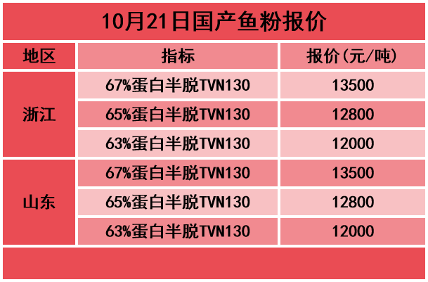 浙江地区,67%蛋白国产鱼粉参考报价在13500元/吨,65%蛋白国产鱼粉参考报价在12800元/吨,63%蛋白国产鱼粉参考报价在12000元/吨。