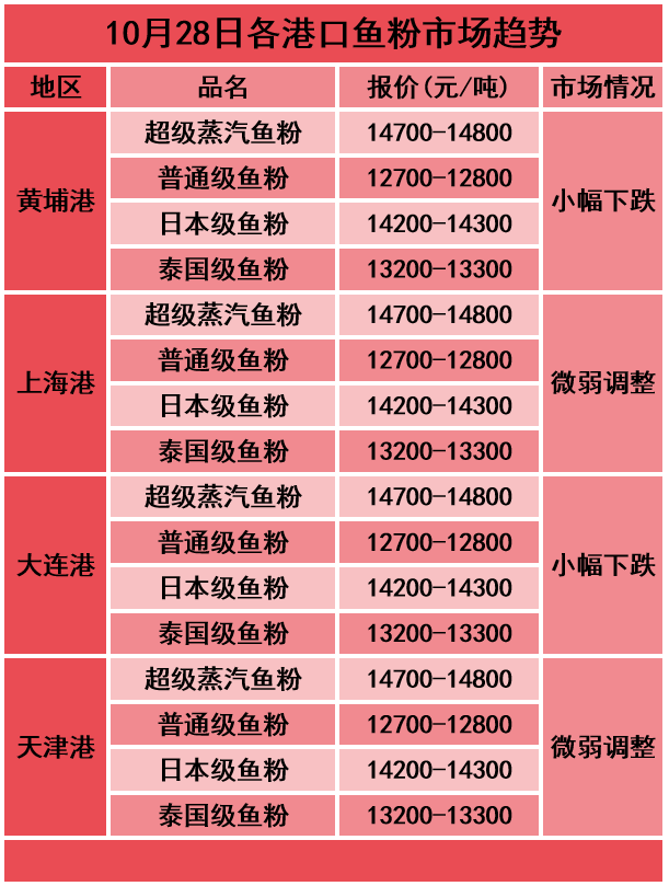 10月28日饲料原料行情:鱼粉价格小幅下跌,豆粕价格上涨