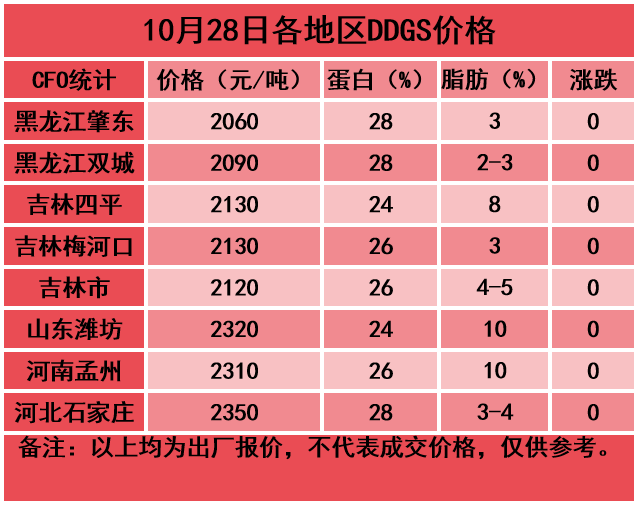 今日,DDGS价格平稳。近期原粮玉米价格上涨,部分酒精企业生产亏损压力增加,支撑其挺价心态,而终端养殖需求暂无明显增加,下游市场需求一般,饲企采购积极性一般。11月份原料玉米价格总体继续偏弱震荡走势为主,叠加其他强关联植物蛋白粕价格总体偏弱走势的影响,多方因素纠缠博弈,我们预判11月份期间大多数时候DDGS交易价格总体偏弱震荡走势为主的可能性更大,11月份月度均价环比继续下跌的可能性更大。