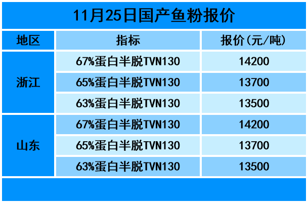 浙江地区,67%蛋白国产鱼粉参考报价在14200元/吨,65%蛋白国产鱼粉参考报价在13700元/吨,63%蛋白国产鱼粉参考报价在13500元/吨。