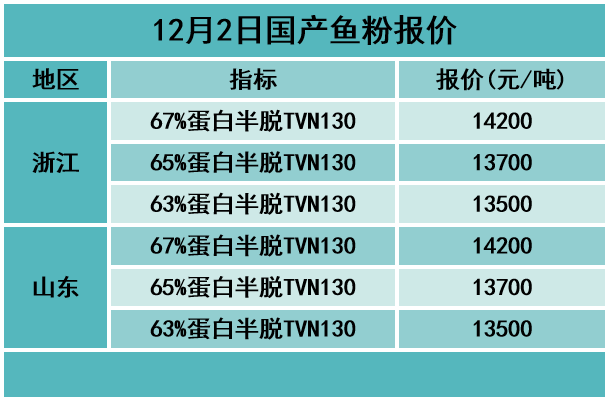 浙江地区,67%蛋白国产鱼粉参考报价在14200元/吨,65%蛋白国产鱼粉参考报价在13700元/吨,63%蛋白国产鱼粉参考报价在13500元/吨。