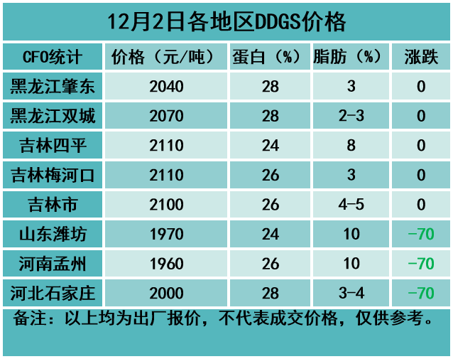 今日,DDGS价格走弱。近期终端养殖需求欠佳,下游用户消化库存,按需随用随采,部分DDGS产品品质偏差,酒精企业降价接单。我们预判12月份期间大多数时候DDGS交易价格总体继续偏弱震荡走势为主的可能性更大,下半月跌势放缓且不排除部分区域市场存在止跌回涨机会,12月份月度均价环比继续下跌的可能性更大。
