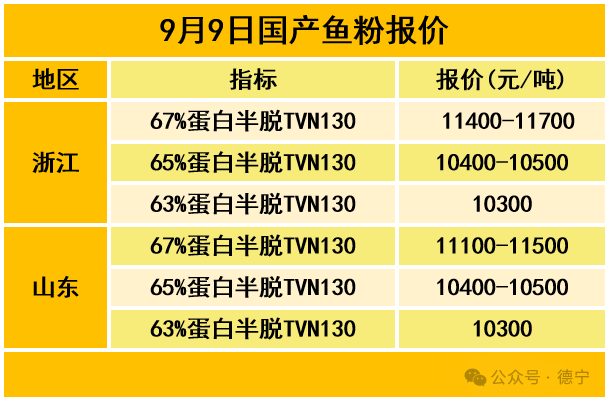 山东地区,67%蛋白TVN130国产鱼粉参考报价11100-11500元/吨,65%蛋白TVN130国产鱼粉参考报价10400-10500 元/吨,63%蛋白TVN130国产鱼粉参考报价10300元/吨。